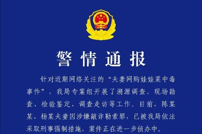 “网购娃娃菜中毒”夫妻,涉敲诈勒索罪!浙江警方通报
