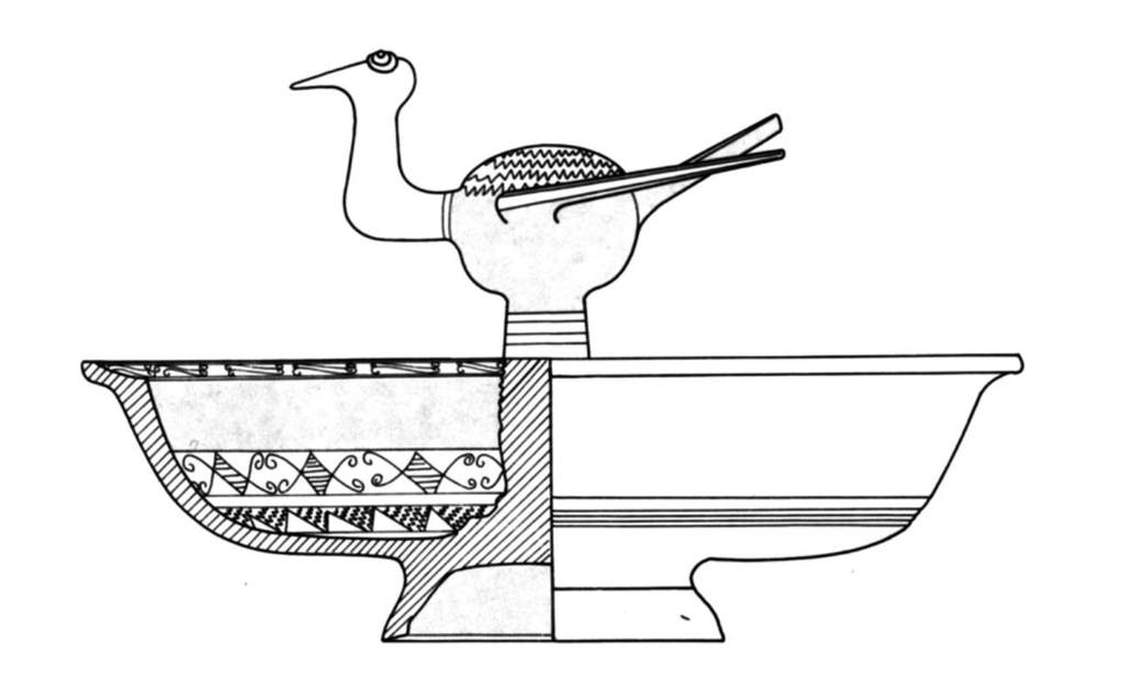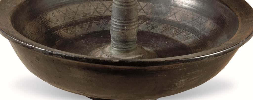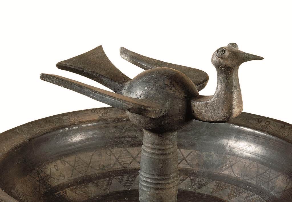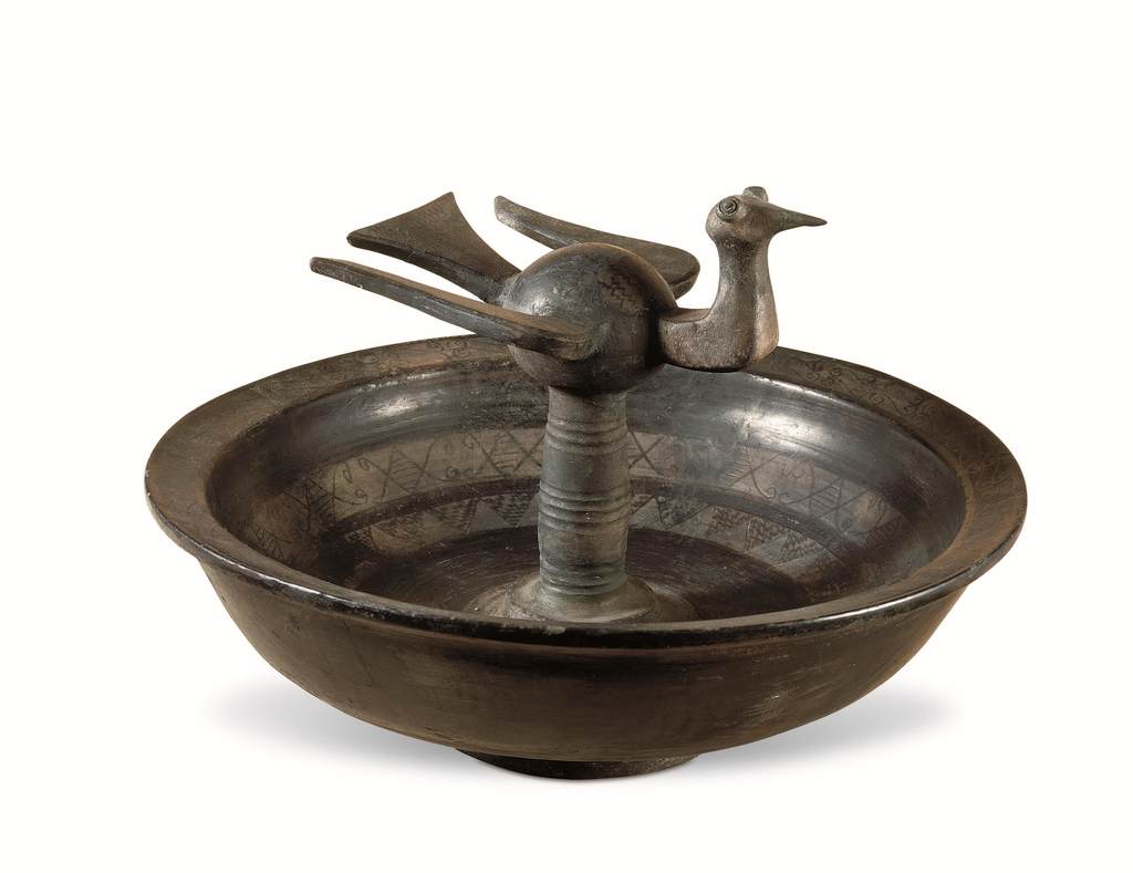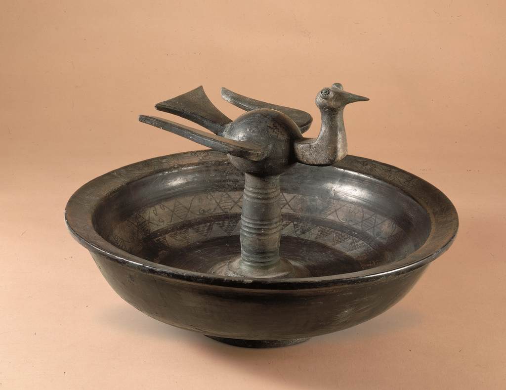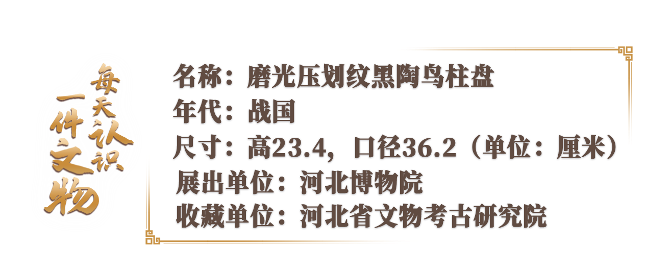 △战国磨光压划纹黑陶鸟柱盘河北博物院展出河北省文物考古研究院藏