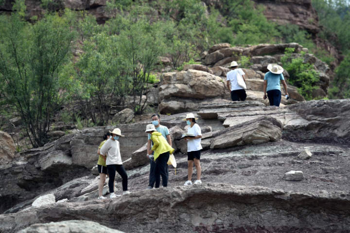 2022年7月25日,大学生在河北省石家庄市井陉县测鱼镇观察叠层石现象。