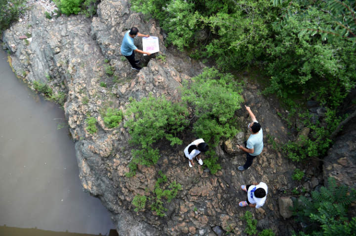 2022年7月25日,大学生在河北省石家庄市井陉县测鱼镇观察岩石特性。