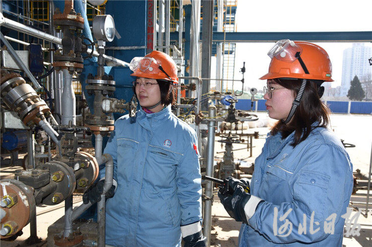 中国石化沧州炼化公司特级技师王卿(左)给同事讲解连续重整装置操作要点。河北日报通讯员于铁洪摄