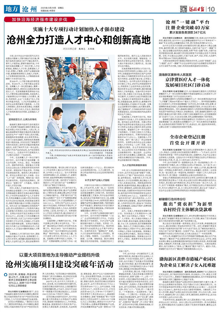 同时,实施人才创新高地行动计划。加快建设全省重要人才中心和创新高地,支持渤海新区黄骅市实施沿海经济崛起带人才专项和生物医药产业人才支持专项,利用京津冀自主创新示范区和自贸区先行先试的延伸政策,积极承接京津项目,持续开展国内重点大学博士后挂职活动。依托北京·沧州渤海新区生物医药产业园,把北京医药技术人才优势和天津企业创新能力优势转化为沧州吸收改造优势。支持沧州经济开发区发挥沧州市科技创业中心、武汉理工大学京津冀协同(沧州)研究院、北京工业大学沧州创新研究院等引才平台作用,在高端人才引进和培养方面取得新进展。支持沧州高新区深化与天津工业大学等高校的合作,引进高层次人才,打造沧州膜材料高端人才聚集地。