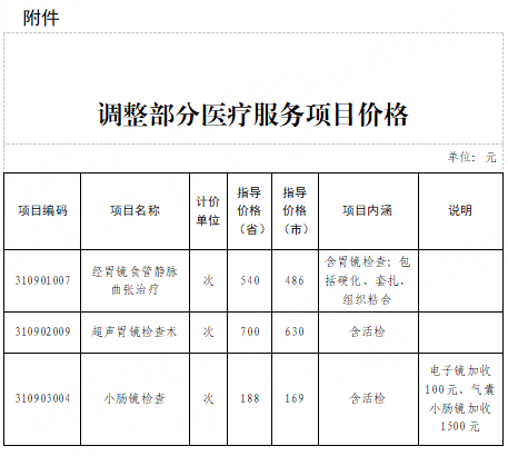 日前,河北省医疗保障局与河北省卫生健康委员会联合发布《关于调整部分医疗服务项目价格有关问题的通知》,根据通知,对经胃镜食管静脉曲张治疗、超声胃镜检查术、小肠镜检查三项医疗服务项目价格进行调整,自2023年11月1日起执行。