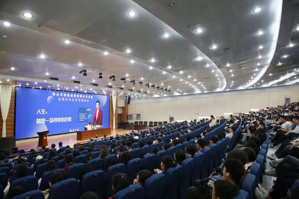 河北日报客户端讯(通讯员徐君彦)11月1日,邢台学院客座教授聘任仪式暨白燕升学术报告会在邢台学院体育馆学术报告厅举行。校党委书记贾云霄致欢迎辞,党委副书记、校长蔡振禹为白燕升颁发聘任证书,副校长肖士恩主持,美术与设计学院、戏剧影视艺术系、音乐舞蹈学院、文学院等师生约700人参加。