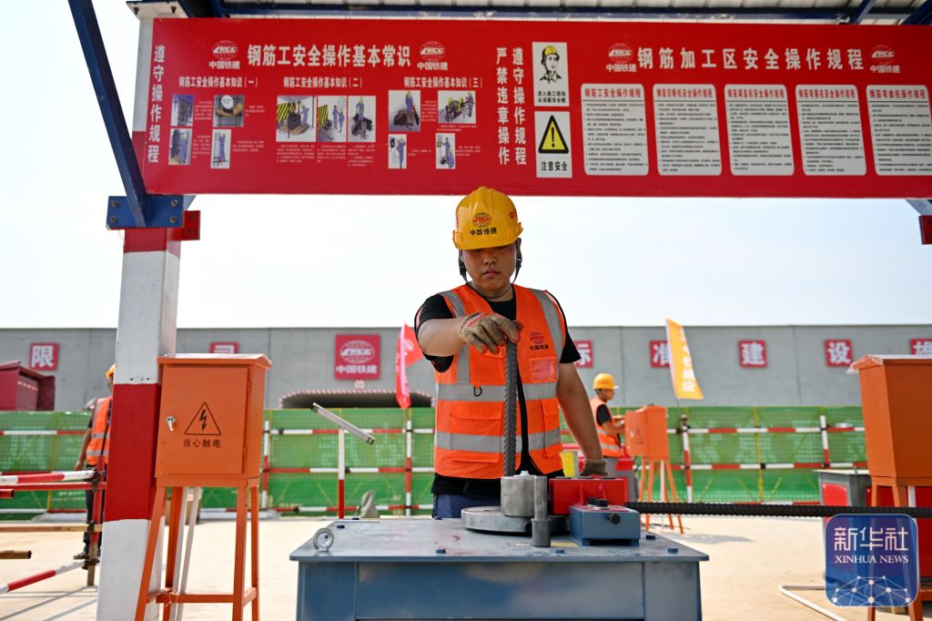 8月23日,中铁建设集团工人在雄忻高铁唐县站建设现场处理钢筋。