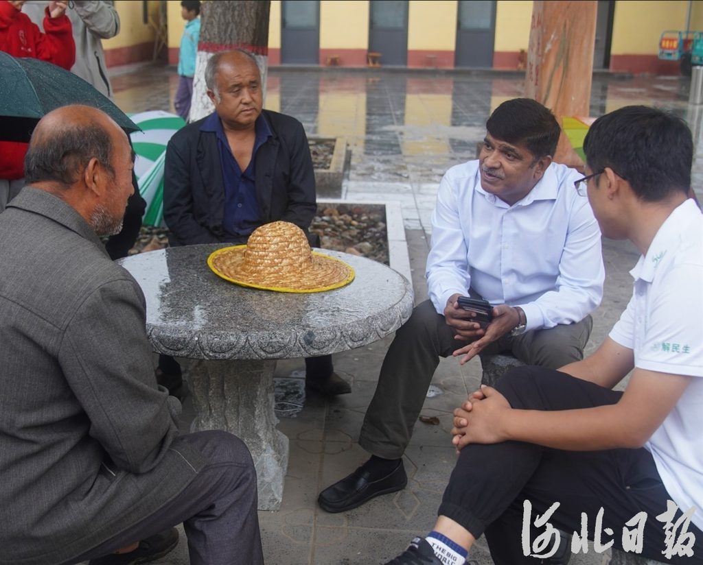2023年9月24日,曲周县白寨科技小院内,联合国粮农组织官员塞尔瓦拉吉(右二)在同曲周县北邮村村民吕志海(左一)等人进行交谈。(资料片)赵新宇摄