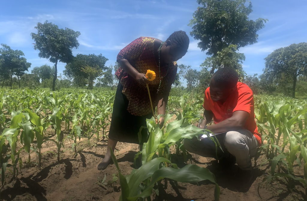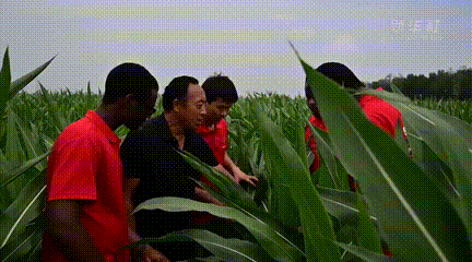 里萨萨兹的农田里,非里和合作农户一起,在观察、记录玉米植株的生长情况。非里供图