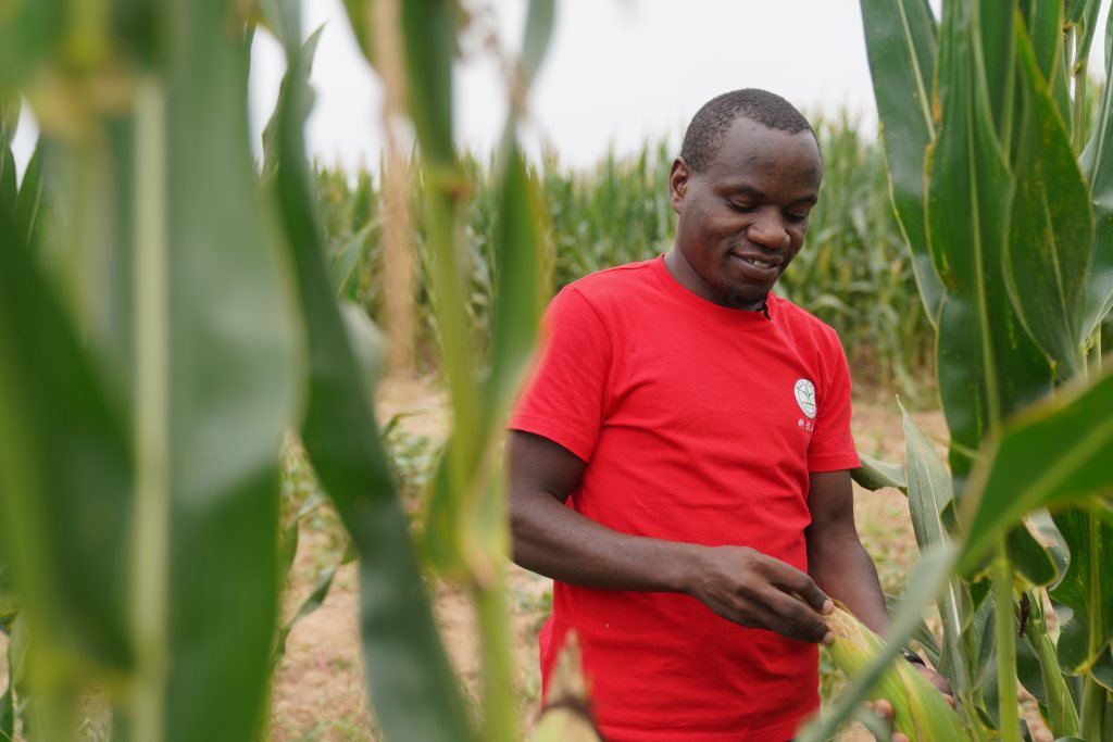 马拉维里萨萨兹科技小院院长非里展示科技小院合作农户和普通农户种植的玉米。(资料片)中国农业大学供图