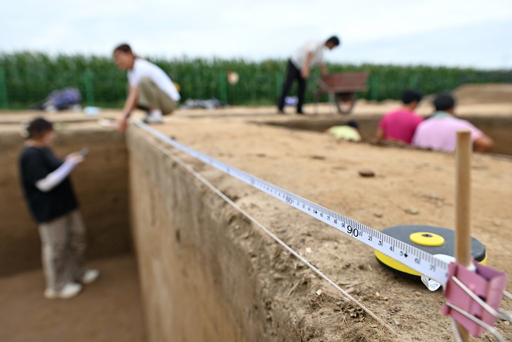 ↑9月5日,考古队员在柏人城遗址第五次考古发掘现场进行测量工作。