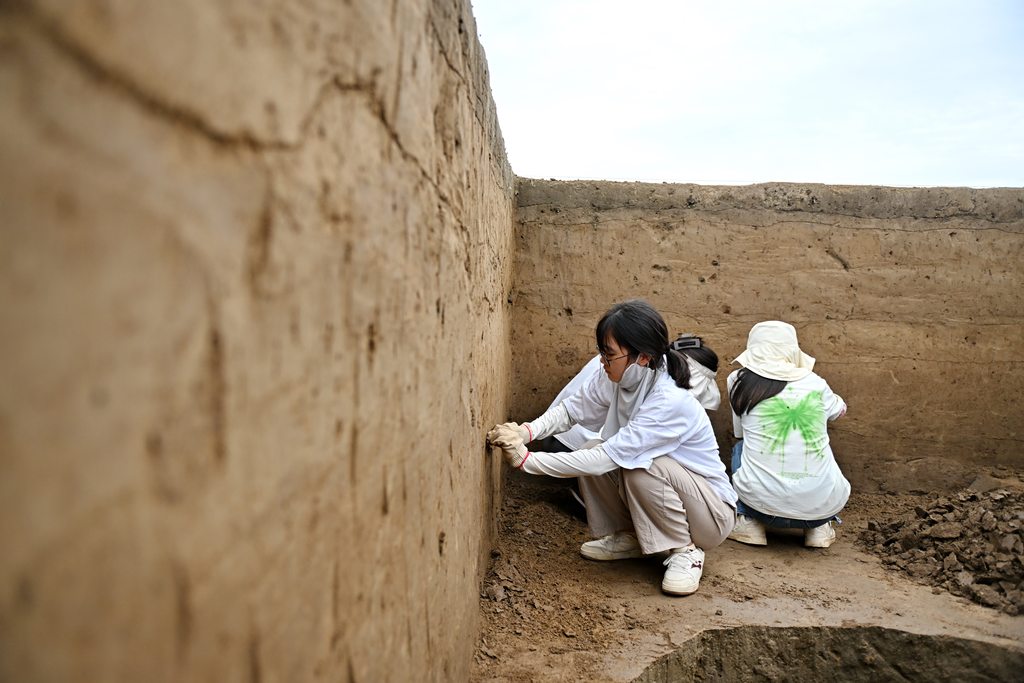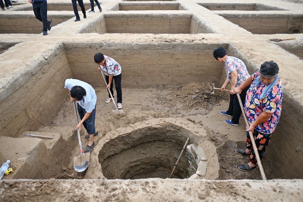↑9月5日,工人在柏人城遗址第五次考古发掘现场清理泥土。