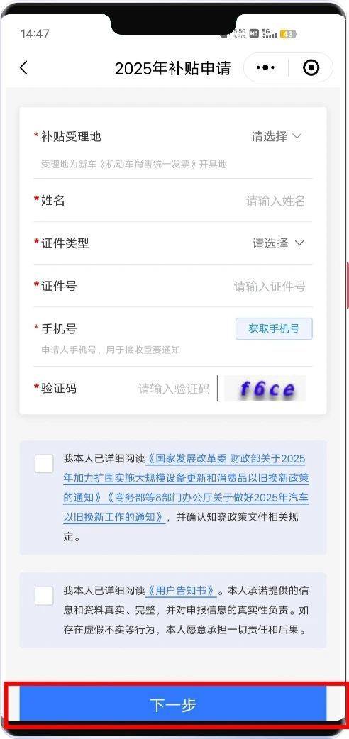 ③根据提示,填写申请人信息、报废汽车信息、购置新车信息,即可申请汽车以旧换新补贴。