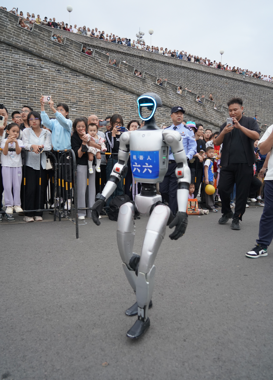正定城墙下,机器人与游客互动。图片来源:自在正定