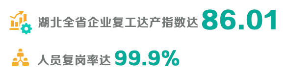 从3月11日至5月17日,湖北全省企业复工达产指数达86.01,基本与全国同步;全省5874个亿元以上续建项目应复尽复,截至5月18日,人员复岗率达99.9%。