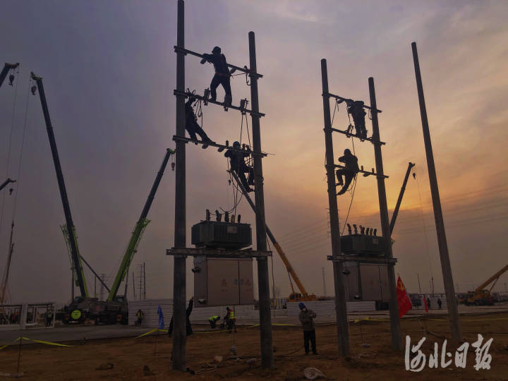 图为供电公司作业人员日夜加紧施工。河北日报通讯员康伟、徐广摄