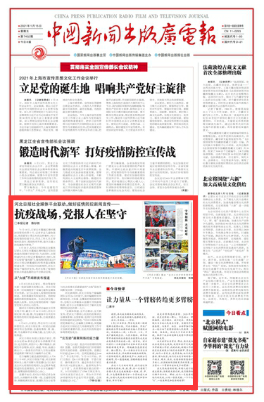 今天,中国新闻出版广电报在头版显著位置刊发《河北日报社全媒体平台联动,做好疫情防控新闻宣传——抗疫战场,党报人在坚守》的长篇通讯,对近期河北日报疫情防控新闻宣传工作进行了详细报道,全文如下: