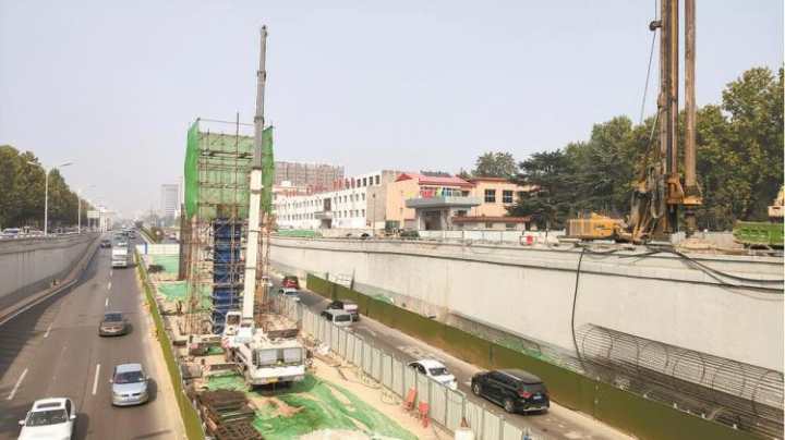 石家庄市槐安路西二环立交桥一期工程处于石市交通最繁忙的两条城区主干道的交叉点,周边居民小区、商务楼林立,地下管线情况异常复杂,市城投集团工作人员采取不断交施工的方法,克服一系列困难和压力,完成一期工程全线最后一根桩基灌注,实现全面进入地上结构物施工的节点式跨越。图为正在施工中的槐安路西二环立交桥一期工程。 记者郄磊摄影报道