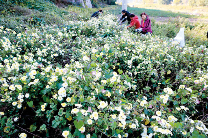 村民们正在收获菊花。记者张海强摄