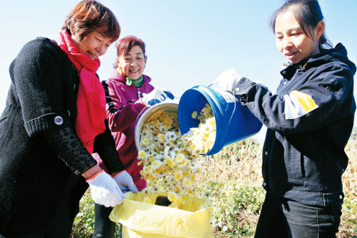 村民们将摘下的菊花收集在一起。记者张海强摄