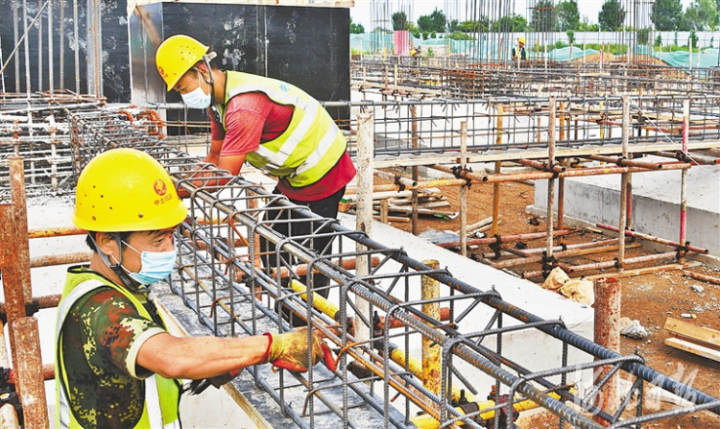 9月1日,在位于石家庄市栾城区的中航电测智能交通(石家庄)产业园项目现场,工人正在绑扎基础梁钢筋。 通讯员李明发摄