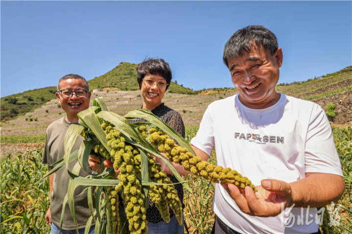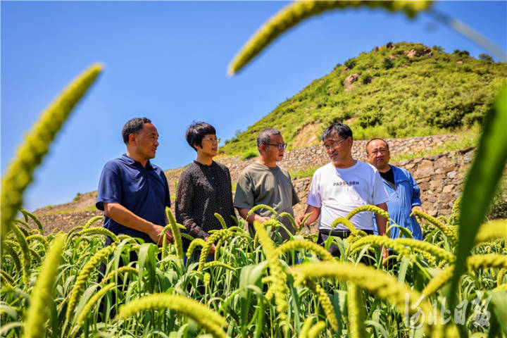 看到新培育的谷子长势喜人,刘正理(右)和团队专家们喜不自胜。河北日报记者刘禹彤摄