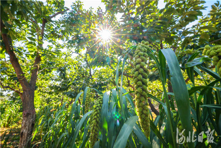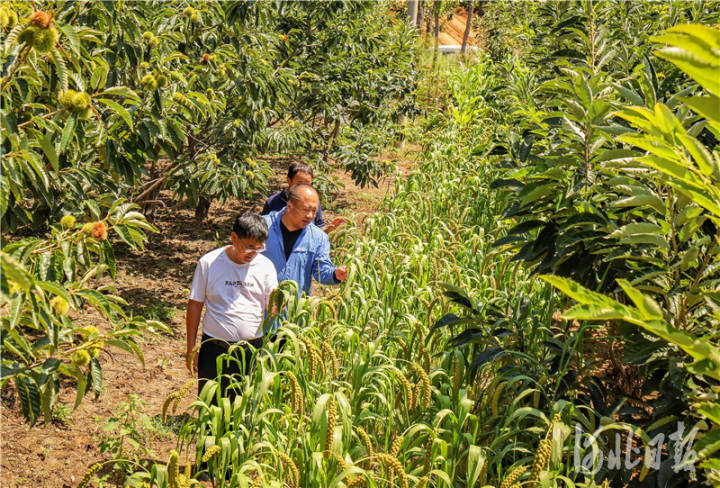 河北日报讯 (记者刘禹彤)8月11日,在唐山市迁西县东荒峪镇板桥村,踏入山间,放眼栗林,株株繁茂,挂满栗蓬。走近细瞧,栗树下饱满的谷穗已由青转黄,三三两两的农户正忙着田间精心管护。