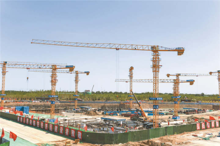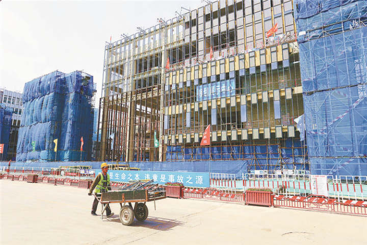 临空服务中心项目施工现场,建筑工人正在紧张忙碌着。记者杨锦乐摄