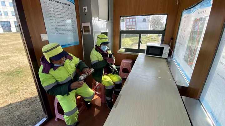 2023年1月17日,苏州相城区,北河泾街道集成指挥中心与如意社区共同将核酸采样亭打造成“爱心休息站”,供环卫工人等公共服务人员休息,喝茶等,深受欢迎。视觉中国 图