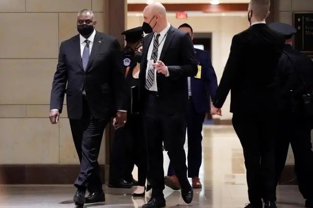 2022年2月2日,在美国首都华盛顿,美国国防部长奥斯汀(左一)准备在国会出席一场听证会。新华社发(沈霆摄)