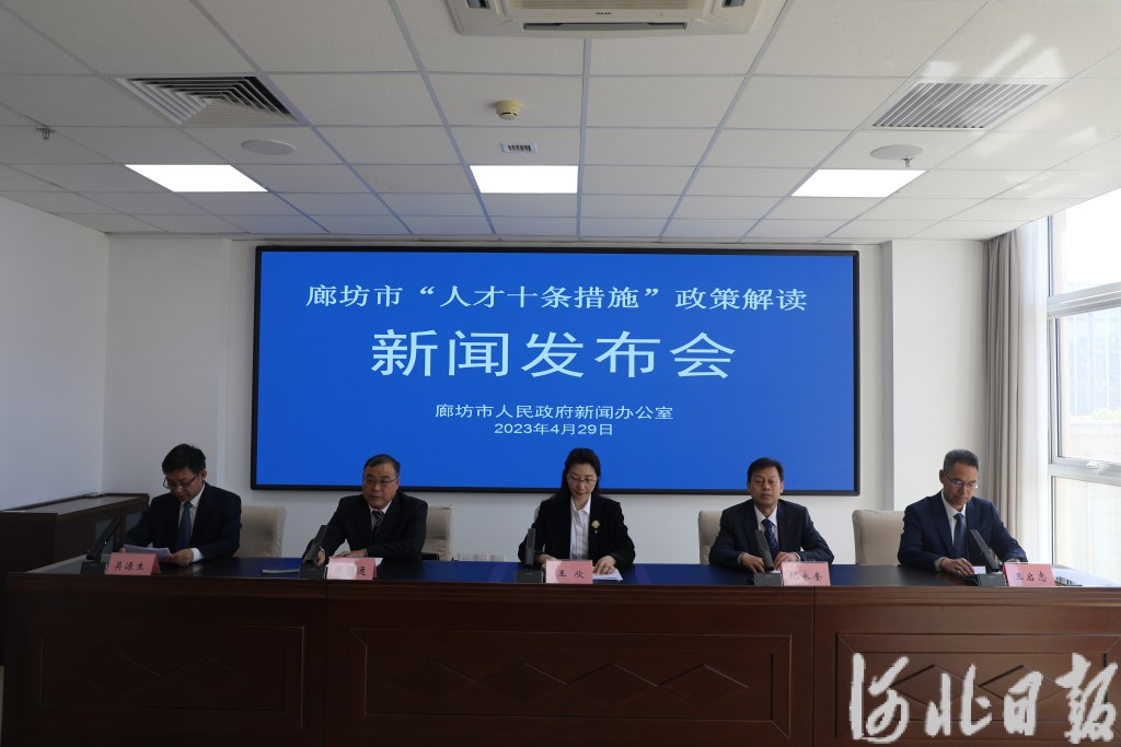 4月29日,廊坊市政府新闻办举行的廊坊市“人才十条措施”政策解读新闻发布会。图为新闻发布会现场。