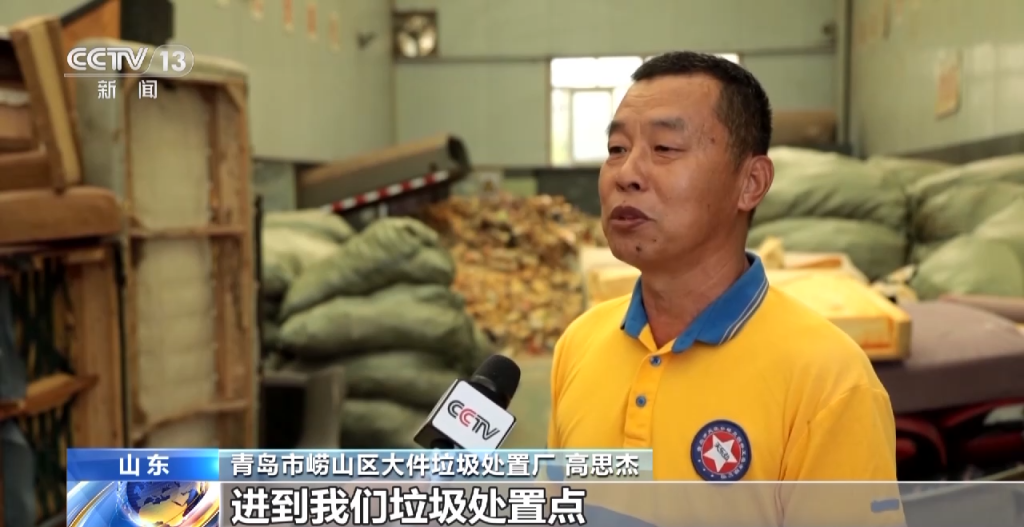 青岛市崂山区大件垃圾处置厂 高思杰:大件垃圾、沙发家具什么的,进到我们垃圾处置点,通过人工分拣,再通过设备的粉碎。粉碎完了以后,木头我们拣出来做再利用,海绵和布再送到垃圾转运站去,做无害化处理。