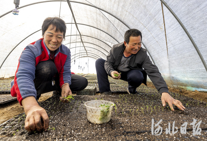 近日,张北县德胜村村民徐海忠和妻子在自家的马铃薯种薯大棚内种植微型薯。河北日报记者李东宇摄
