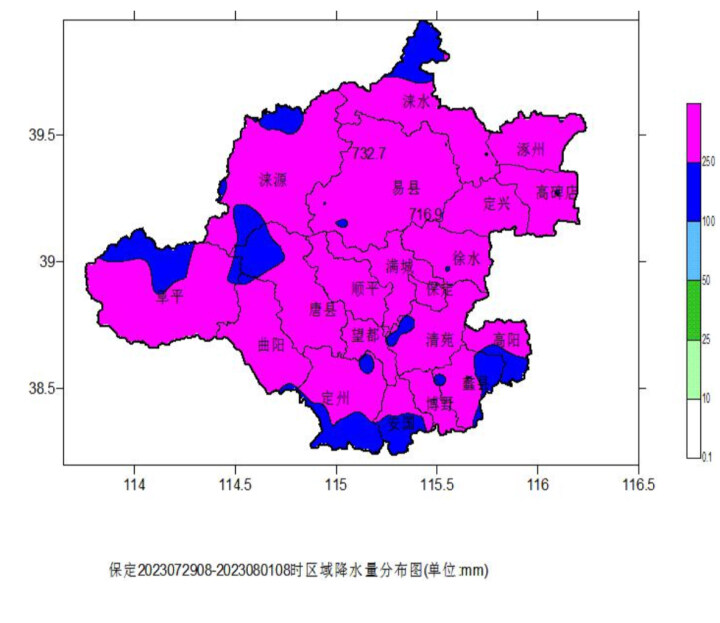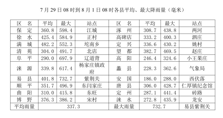 【雨情】29日08时至8月1日08时,保定出现大暴雨-特大暴雨,全市平均降水量337.3毫米,最大降水量易县紫荆关732.7毫米,最大雨强82.2毫米/小时。