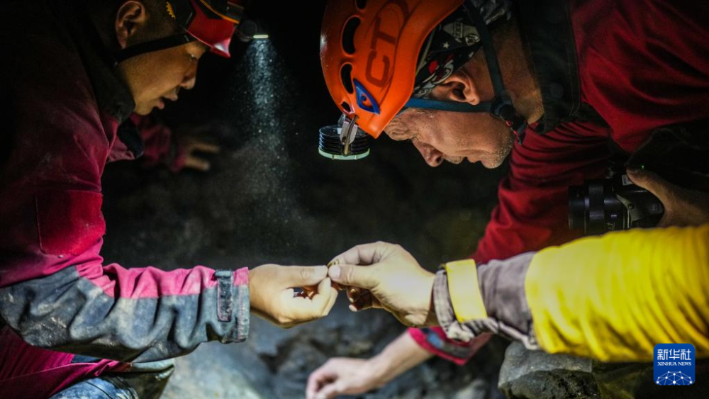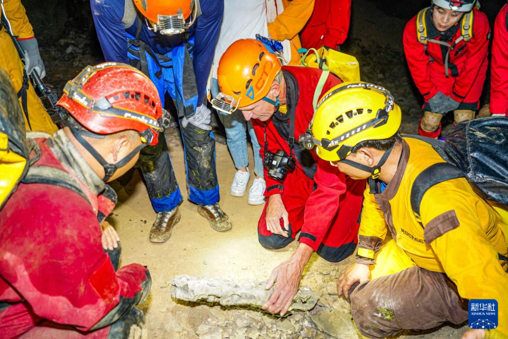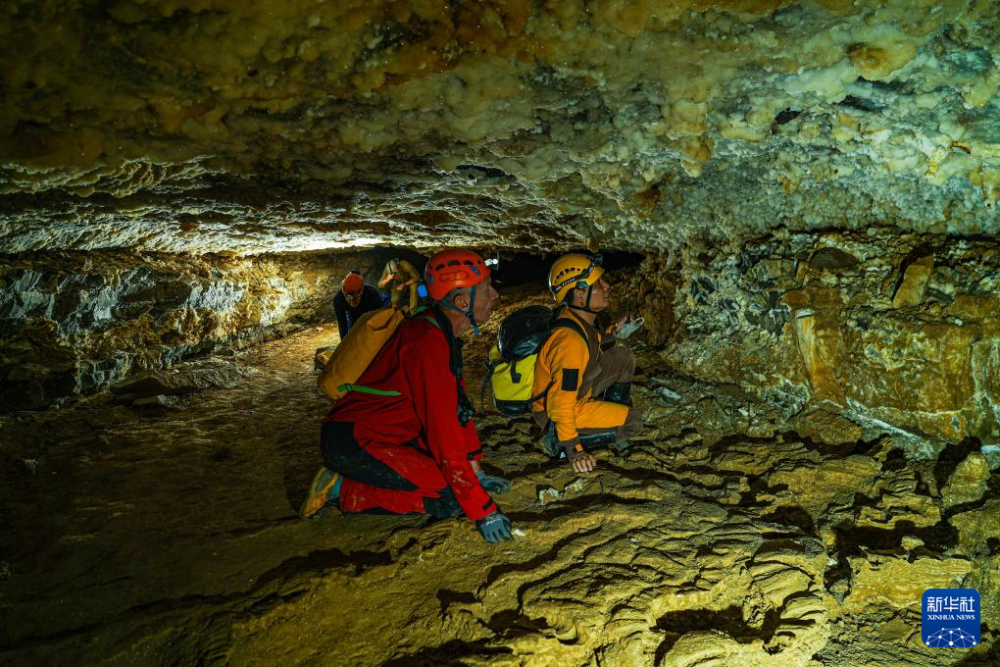 意大利专家和贵州省山地资源研究所科考队员在双河洞一处支洞中进行科考(9月22日摄)。新华社发(赵飞摄)
