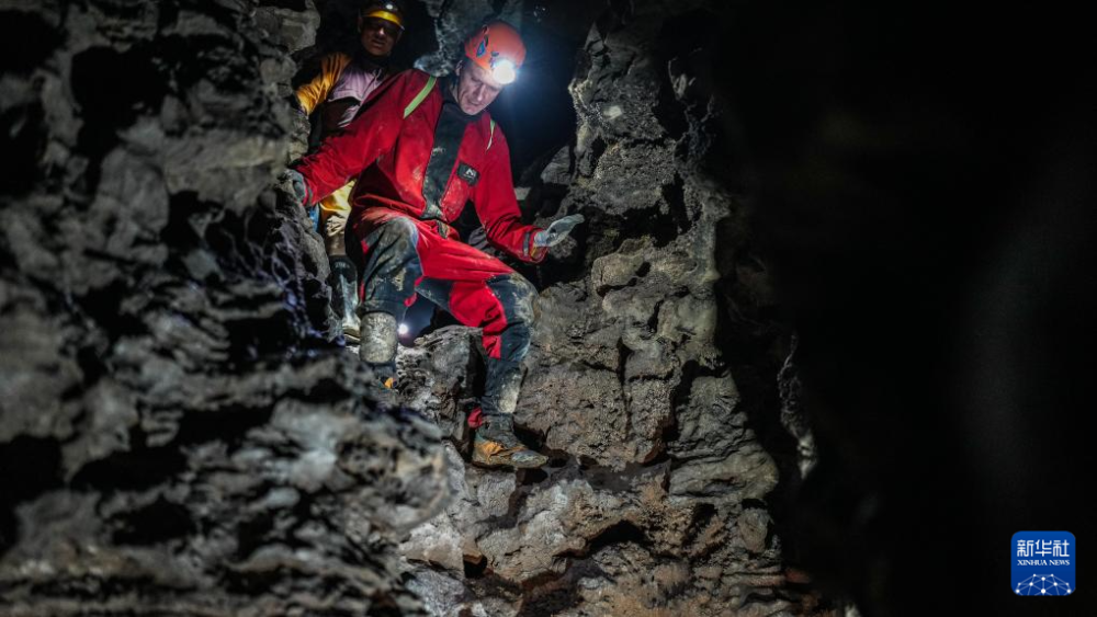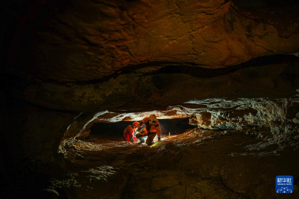 意大利专家和贵州省山地资源研究所科考队员在双河洞一处支洞中进行科考(9月24日摄)。新华社记者陶亮摄