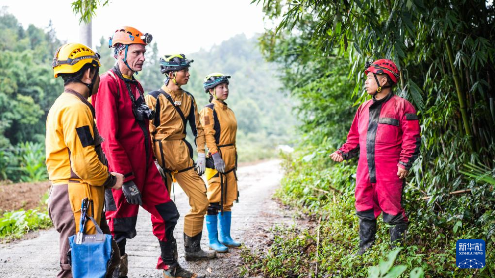 意大利专家(左二)和贵州省山地资源研究所科考队员整队完毕准备开始探洞(9月24日摄)。新华社记者陶亮摄