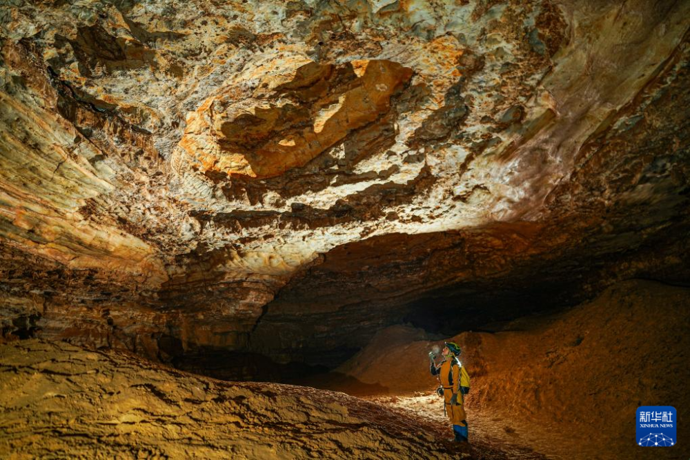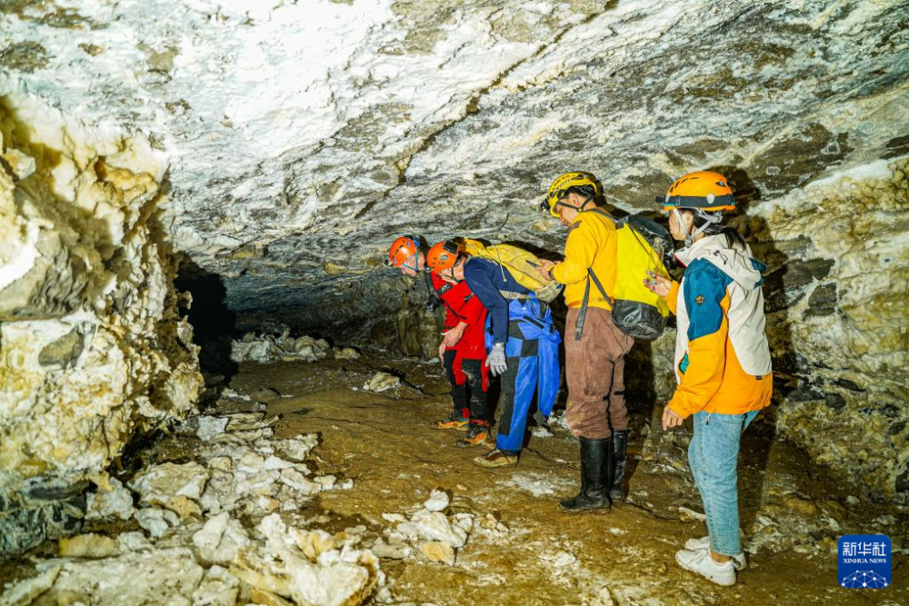 贵州省山地资源研究所科考队员在双河洞一处支洞中观察岩壁(9月23日摄)。新华社发(赵飞摄)