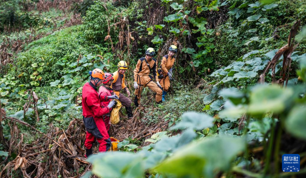意大利专家和贵州省山地资源研究所科考队员在前往探洞的途中(9月24日摄)。新华社记者陶亮摄