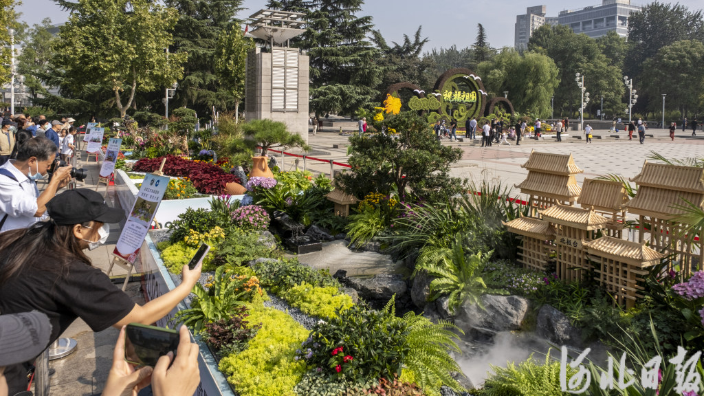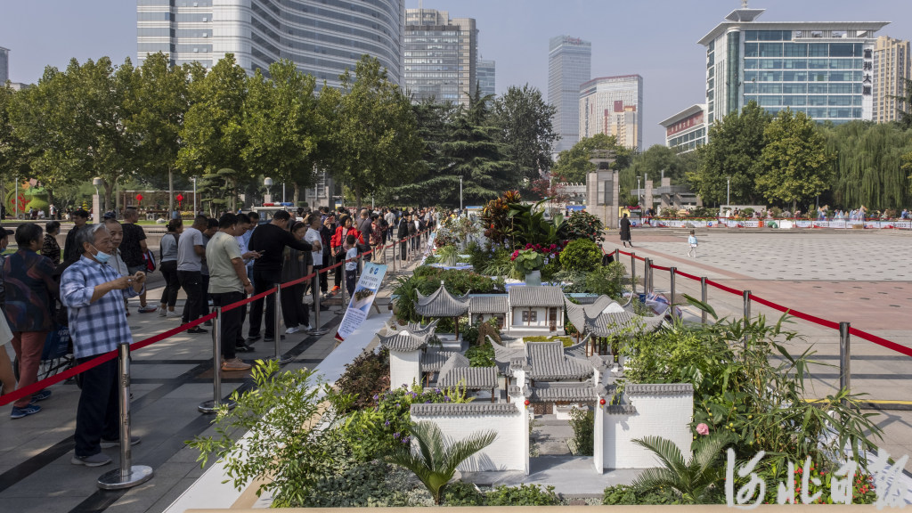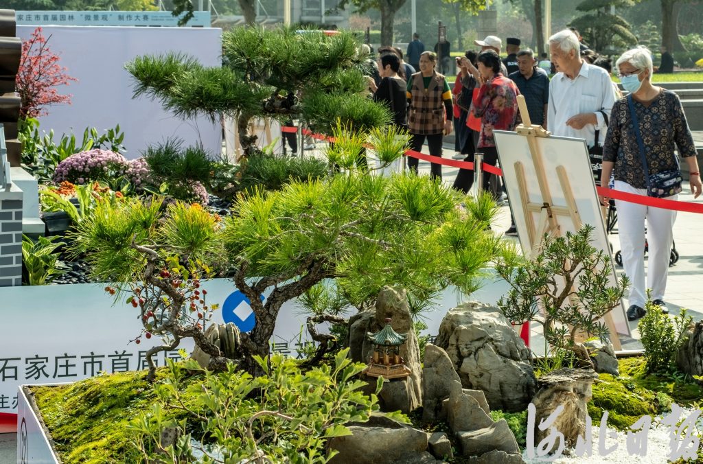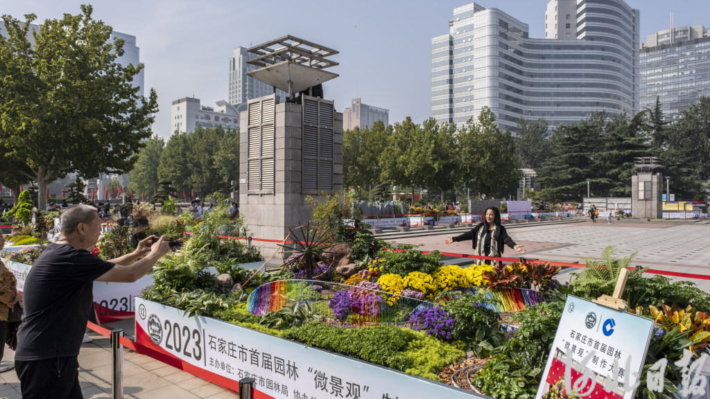 9月29日,游客在石家庄市人民广场欣赏园林“微景观”作品。