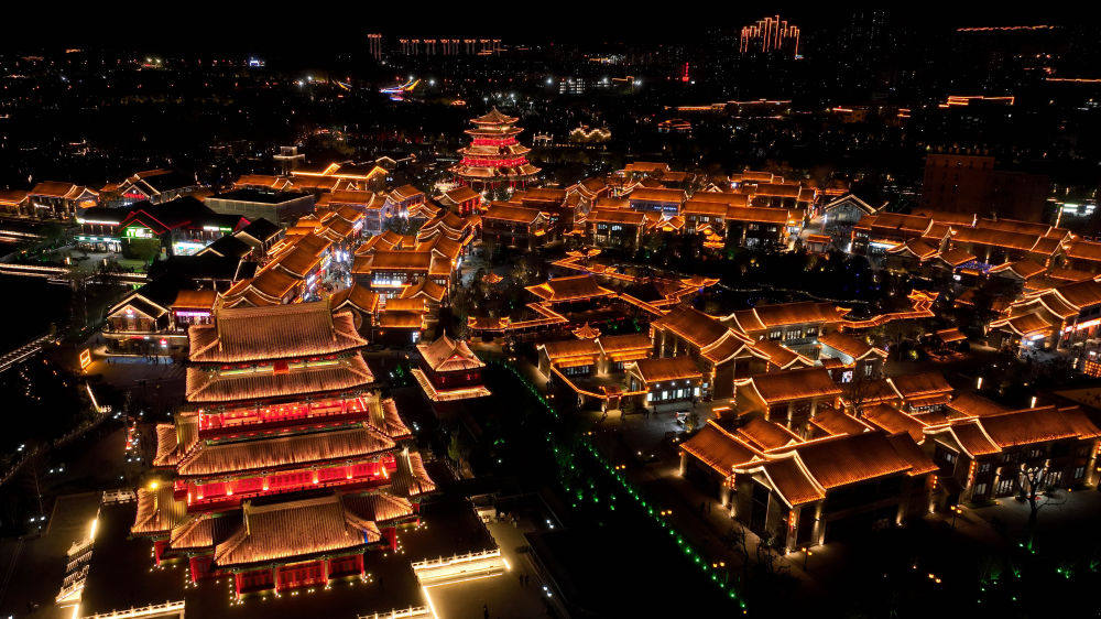 ↑这是10月26日拍摄的河北省沧州市南川老街夜景(无人机照片)。新华社记者 骆学峰 摄