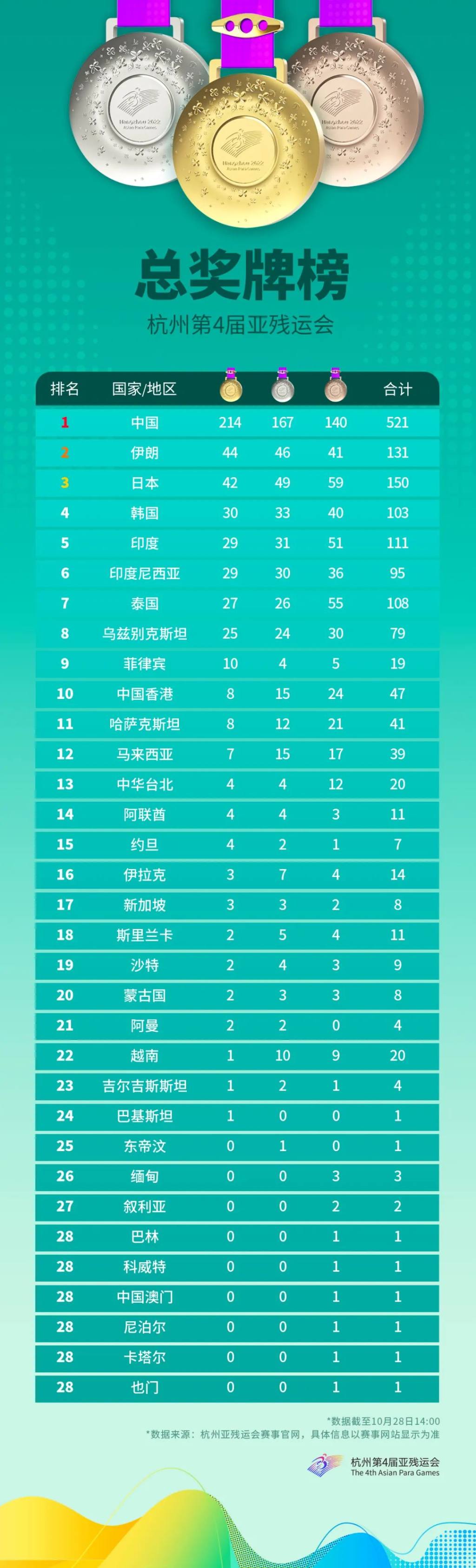 今晚(10月28日),杭州亚残运会闭幕式将举行,目前,所有比赛均已结束。据杭州第4届亚残运会官方公众号消息,本届亚残运会,中国队439人参加全部22个大项、390个小项,共收获金牌214枚、银牌167枚、铜牌140枚,打破世界纪录13次、亚洲纪录35次、亚残运会记录136次。