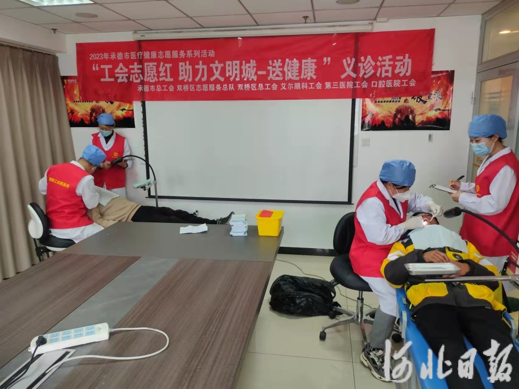 图为“工会志愿红助力文明城——送健康”义诊活动中,承德市口腔医院医务人员为快递小哥进行口腔健康检查。