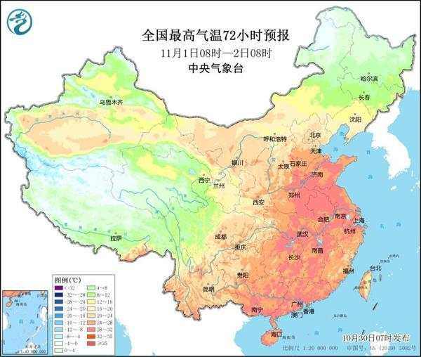 本周前期,中东部升温还将继续。 预计本周初,全国大部仍会以升温为主,并且大幅偏离常态。特别是华北、黄淮一带,11月初暖热程度还会升级,部分地区最高气温甚至会超过30℃部分,比如,郑州,菏泽等地可能在11月1日前后迎来当地11月观测史上的首个30℃。