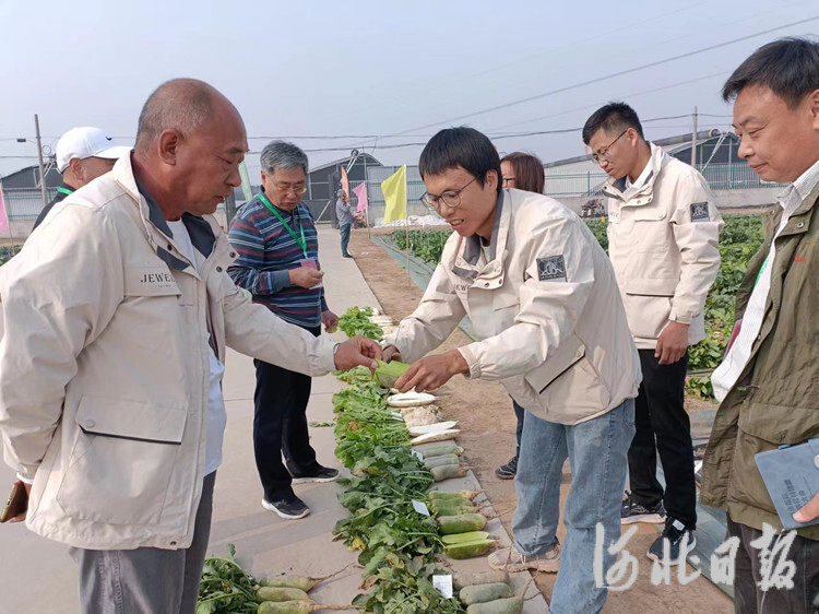 河北捷如美农业科技开发有限公司首席育种专家张全杰(左一)联合行业专家对蔬菜进行评选。李书杰摄