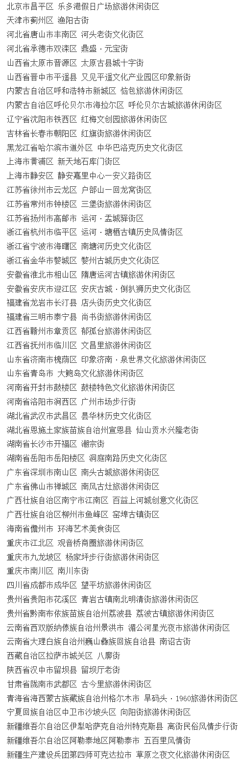 据文化和旅游部官网消息,根据《旅游休闲街区等级划分》行业标准,按照《文化和旅游部办公厅关于开展新一批国家级旅游休闲街区认定工作的通知》安排,经评审,现将第三批国家级旅游休闲街区名单公示如下(按行政区划顺序排列):