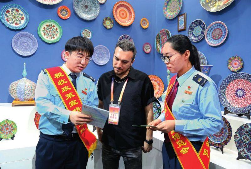 唐山市税务系统组织税收政策宣传服务队走进第二十四届唐山中国陶瓷博览会,向参会展商介绍最新税费优惠政策和办税缴费新举措(2023年9月16日摄)。刘洋摄
