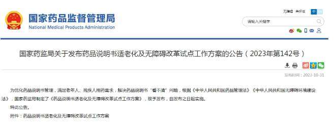 药品说明书的“适老化”改革又向前迈进了一步。10月31日,国家药监局发布了《药品说明书适老化及无障碍改革试点工作方案》,决定在部分口服、外用等药品制剂中开展药品说明书适老化及无障碍改革试点。方案自发布之日起实施。