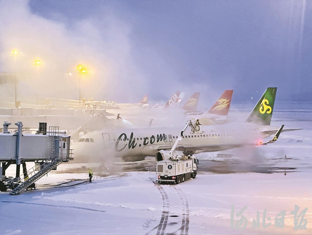 12月14日,石家庄正定国际机场工作人员对出港航班进行除防冰作业。河北日报记者赵威摄