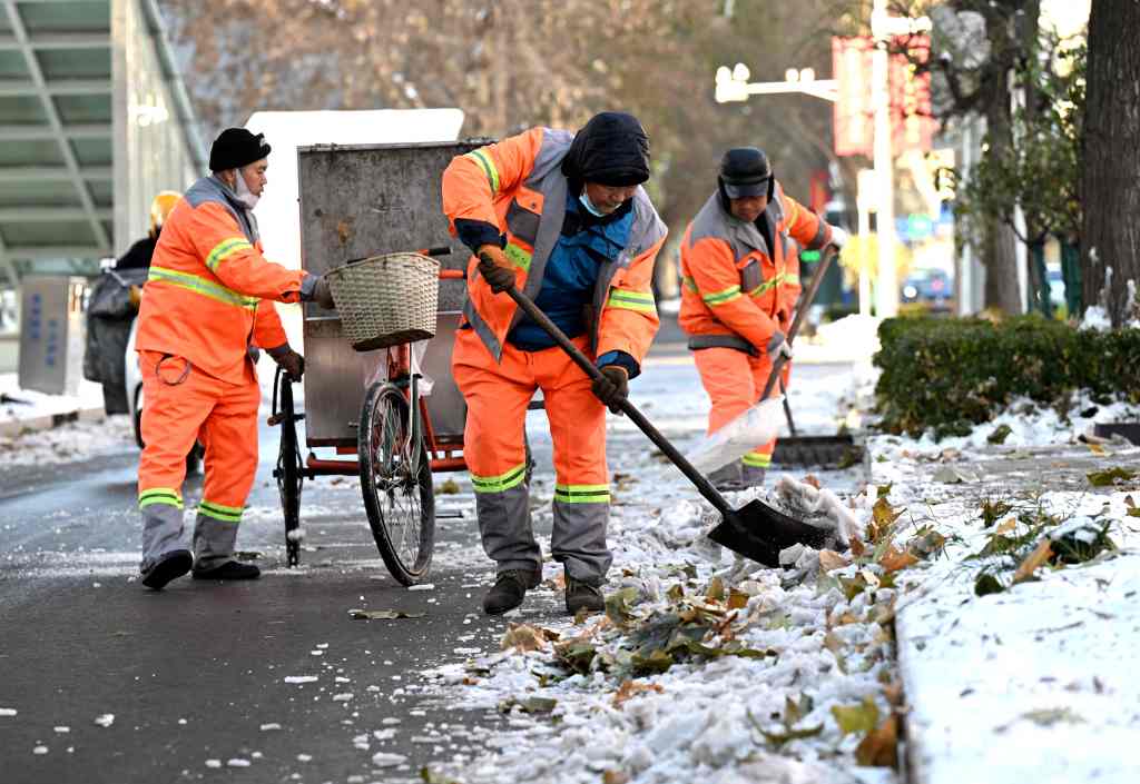12月17日,环卫工人在石家庄市桥西区中山路上清理积雪。新华社发(陈其保摄)
