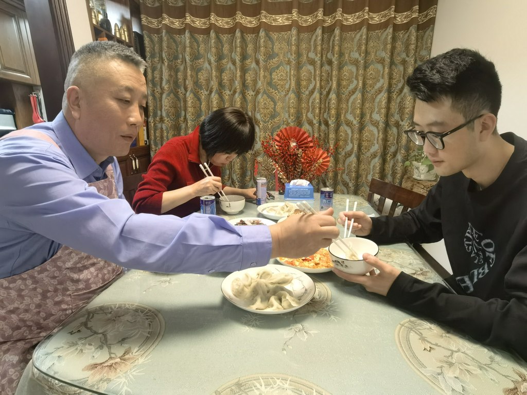 2月9日晚,秦皇岛市公安局海港分局燕园派出所民警王宝军一家三口一起吃年夜饭。河北日报记者孙也达摄