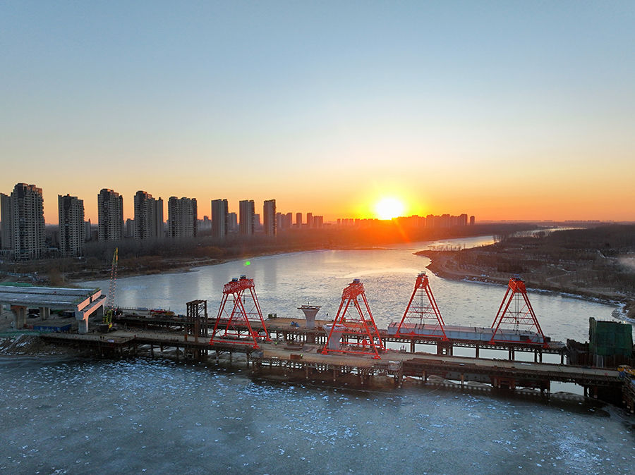 1月15日拍摄的建设中的厂通路潮白河大桥(无人机照片)。新华社记者 邢广利 摄
